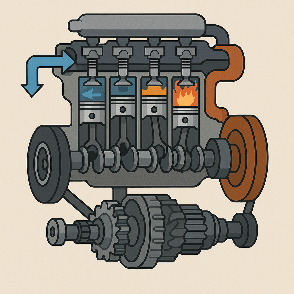 An educational song teaching about combustion engine mechanics and the four-stroke cycle using the rhythm of 'Wheels on the Bus'.
